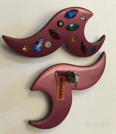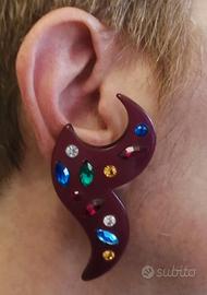 Orecchini in plastica a clip bordò con applicate pietre colorate. La parte più larga misura cm. 7,8.