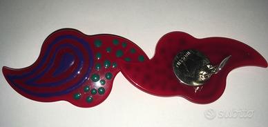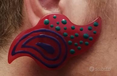 Orecchini in plastica base rosso scuro con disegni in rilievo La parte più larga misura circa cm. 7,8