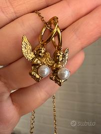 Orecchini in acciaio placcati oro 18K con angeli e perle. Come nuovi. Non cambiano colore, resistenti all’acqua.