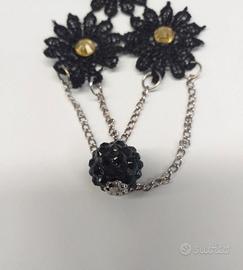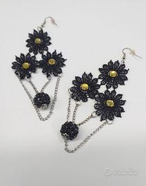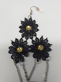 Orecchini a forma di fiore, realizzati in pizzo nero, con strass gialli. Lunghezza cm.12.