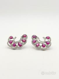 Orecchini in oro bianco 18 KT ( 750 ‰ ) di grammi 6.35 con rubini naturali forma a goccia taglio sfaccettato ct 3.12 totali e diamanti naturali forma tonda e taglio a brillante ct 1.02 totali; purezza VVS colore G.