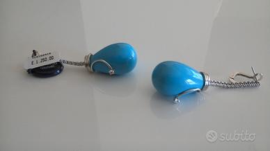 Orecchini in Oro 18 Kt. Bianco e Diamanti con Gocce di Pasta di Turchese.
