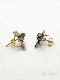 Orecchini in oro giallo 18 KT( 750 ‰ ) di grammi 5.44 impreziositi da diamanti naturali forma tonda e taglio a brillante e da zaffiri e rubini naturali. Epoca 1940.