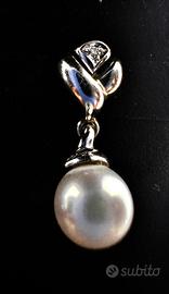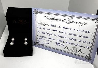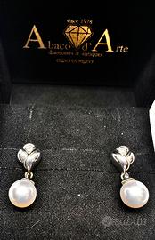 Coppia di orecchini in oro bianco 18kt con due perle natirali coltivate acqua di mare “akoya” di millimetri compresi tra 7,5 e 8 e quattro diamanti natirali taglio brillante per un titale stimato di 0,04 carati.