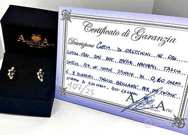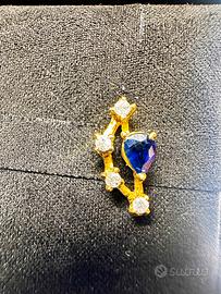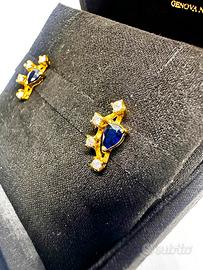 Coppia di orecchini in oro giallo 18kt con due zaffiri naturali taglio goccia per un totale stimato di 0,60 carati e 8 diamanti naturali taglio brillante per un totale stimato di 0,20 carati.