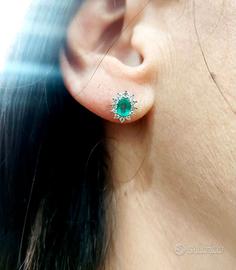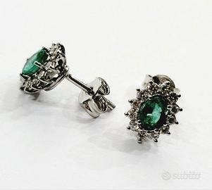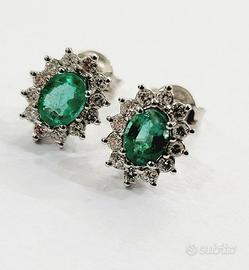 Orecchini con Smeraldi ovali 1,11 ct contornati da diamanti 0,40 ct in Oro Bianco 18kt ( 750 ) - 2,30 gr circa