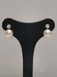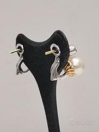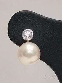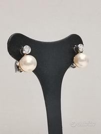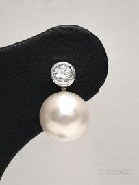 Orecchini a lobo in oro bianco e giallo 18 carati (750/1000) con perle giapponesi di acqua salata di diametro 8,5/9,0 mm e diamanti naturali taglio brillante di caratura totale di circa 0,30 carati, colore F/G, purezza SI1/SI2.