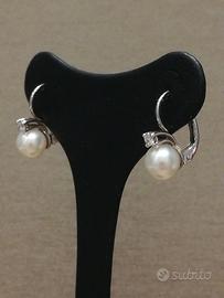 1) Orecchini a monachella in oro bianco 18 carati (750/1000) con perle giapponesi di acqua salata di diametro 7,0/7,5 mm e diamanti naturali taglio brillante di caratura totale di circa 0,10 carati, colore G/H, purezza SI1/SI2.