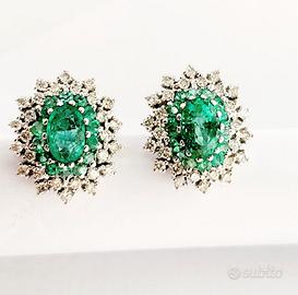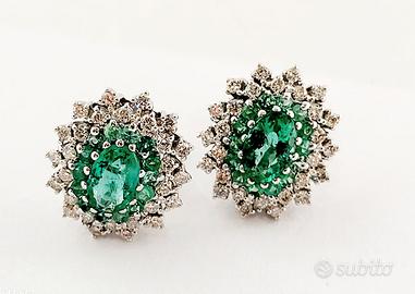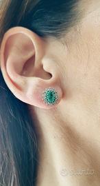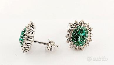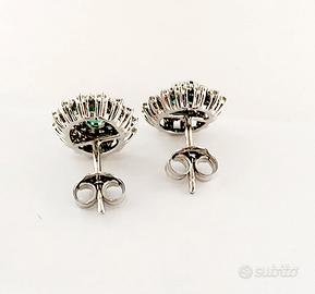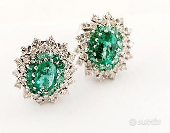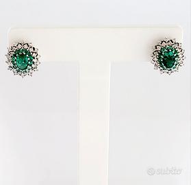 Orecchini bottone fantasia con Smeraldi ct 1,75 e contorno di Diamanti ct 0,48 lavorato in Oro bianco 18kt-750 - Grammi 3,11