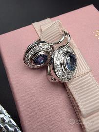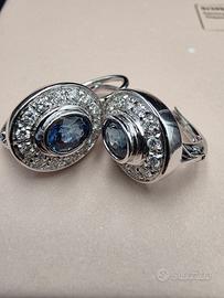 Bellissimi orecchini in oro bianco massiccio 18 carati con 2 zaffiri di primissima qualità tailandesi taglio ovale di 0,80 carati totali e 30 diamanti naturali taglio brillante intorno di 0,30 carati complessivi.