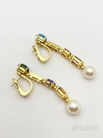 Orecchini in oro giallo 18 KT ( 750 ‰ ) di grammi 13.64 impreziositi da diamanti naturali forma tonda e taglio a brillante, pietre e perle coltivate. Firmati BVLGARI collezione ALLEGRA con scatola.