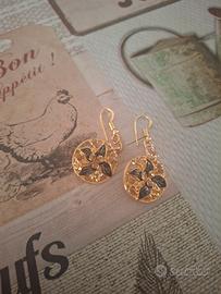 il simbolo presente sugli orecchini rappresenta un motivo floreale stilizzato che ricorda un quadrifoglio o un fiore a quattro petali inserito all interno di una cornice circolare traforata .