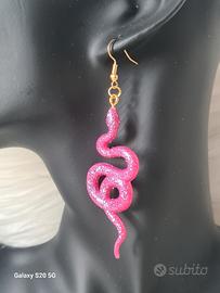 Orecchini pendenti a forma di serpente, color fucsia con glitter, originali e super luminosi.