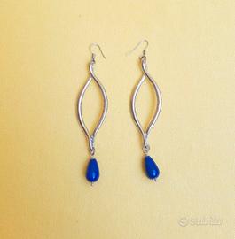 Orecchini , pendenti , con parte metallica argentata lucida , disegno effetto mandorla, occhio, e goccia blu intenso.