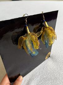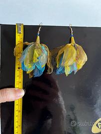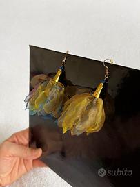 Orecchini pendenti artigianali, fiori in organza. Lunghi. Mai usate.