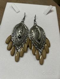 Eleganti orecchini pendenti in stile boho ed etnico, realizzati in metallo color argento con una raffinata lavorazione traforata e dettagli geometrici. Sono arricchiti da perline pendenti color beige/caramello che donano movimento e luminosità al viso. La chiusura a monachella li rende comodi e sicuri da indossare, mentre la lunghezza importante, circa 7–8 cm, li rende perfetti per valorizzare qualsiasi outfit. Ideali sia per look casual che per occasioni speciali, sono in ottime condizioni, pari al nuovo, e rappresentano anche una splendida idea regalo.