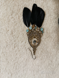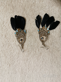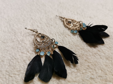 Vendo orecchini pendenti oro con strass acquamarina e brillanti e piume nere. Materiali: metallo, piume, strass. È un pezzo di bigiotteria. Al prezzo vanno aggiunte le spedizion che vanno concordate con il clientei.