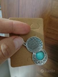 Orecchini in stile bohémien vintage, con pietra turchese centrale incastonata in una montatura rotonda decorata con eleganti motivi a spirale.