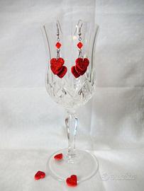 Questi orecchini hanno tre piccoli cuoricini in gomma eva glitter rossa appesi sotto ad una perla bicono in cristallo sempre di colore rosso. Gli orecchini sono completamente realizzati a mano. La lunghezza degli orecchini è di circa 6 cm, monachella inclusa.