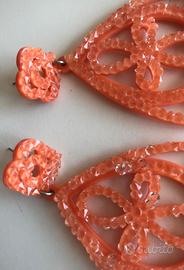 Orecchini per lobi forati, realizzati in resina arancio rosato ricoperti di decorazioni brillanti ad intaglio in resina trasparente. Lavorazione originale caraibica moderna. Nuovi, indossati soltanto durante un défilé. Dimensioni 10x6 cm, molto leggeri