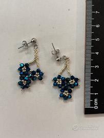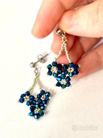 Perline argentate con fiori blu, ricamati a mano in Italia