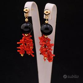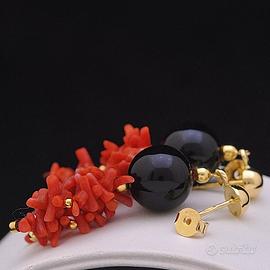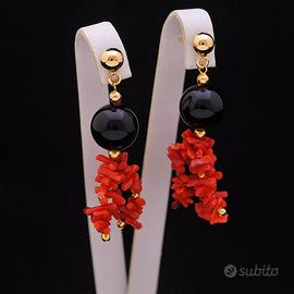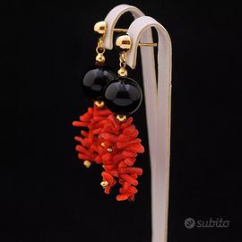 ORECCHINI PENDENTI IN ORO GIALLO 18 KT 750 CON ONICE E CORALLO CERTIFICATO