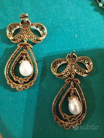 spettacolari e importanti orecchini di alta bigiotteria, a forma di fiocco, in metallo dorato e pasta di turchese, chiusura con perno centrale e farfallina lunghi. 9cm manifattura artigiana