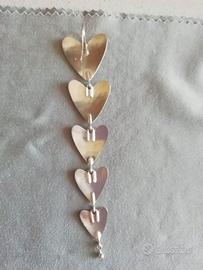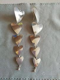 Orecchini da donna pendenti con motivo a cuore. Composti da 5 cuori di grandezza decrescente in metallo colore argento. Misure: lunghezza 10 cm; cuore grande in alto largo 2 cm; cuore piccolo in basso 1 cm. Indossati poche volte.
