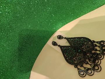 Eleganti orecchini pendenti neri, perfetti per aggiungere un tocco di brillantezza. - Design a goccia con dettagli traforati. - Decorati con brillantini verdi.