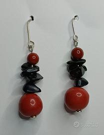 Orecchini pendenti realizzati in ossidiana e pietra naturale rossa come nuovi mai indossati.