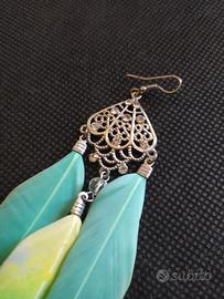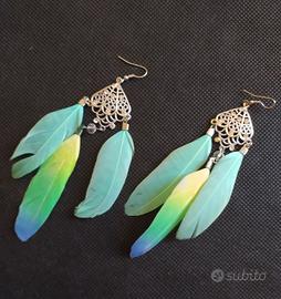 Orecchini lunghi pendenti boho con piume sfumate turquoise-arcobaleno (verde acqua a lime), base argentata a filigrana traforata con cristalli sparkling per movimento ipnotico e luce. Design etnico-chic audace, lunghi, per slanciare il viso, perfetti per festival, serate o look everyday bold. Condizioni top - mai utilizzati, piume intatte e brillanti senza danni, leggeri e comodi!