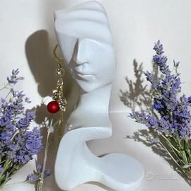 Coppia di orecchini a monachella dal design raffinato: sfera rossa centrale, foglie brillanti con strass e frange con perline pendenti. Perfetti per occasioni speciali o per dare un tocco chic al look quotidiano. Taglia unica, leggeri e comodi da indossare. Nuovi, mai usati.