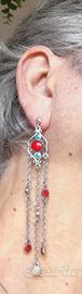 Particolari orecchini pendenti vintage, lunghi 10 cm, tripla catenella, metallo color argento con decorazioni color turchese e rosso, la "farfallina" è in Argento 925. Su richiesta, la "farfallina" può essere sostituita da una "monachella" in Argento 925, si tenga presente che in questo caso l'orecchino si allunga ulteriormente. Mi sono stati regalati molti anni fa, ma non li ho mai indossati perché per me sono troppo lunghi (ne ho indossato uno solo per fare la fotografia). Nel mio profilo puoi trovare altri bijoux e molte interessanti idee regalo.