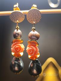 Pietra preziosa Perle di Maiorca color acciaio-blu ,perla naturale grigia ,La rosa è realizzata in corallo pressato. La base degli orecchini è realizzata in acciaio inossidabile rivestito con una resistente lega ipoallergenica color oro.