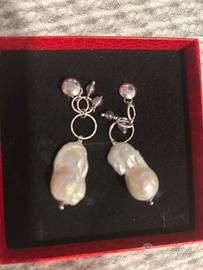 Orecchini , nuovi mai indossati, lavorazione artigianale laboratorio orafo Orogenesi.Lunghezza totale cm 6 e due perline lilla.Realizzati con perle barocche da cm 3. Pendenti con chiusura a farfallina. Confezione originale.