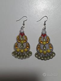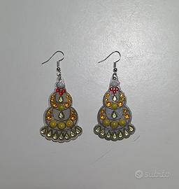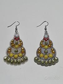 Nello specifico questi sono orecchini bombati multicolore con perline strass rosse e rame, mini gocce verdi luminose e colorate che arricchiscono l'orecchino, ed infine perle bianche e gialle...tutti gli elementi contribuiscono ad esaltare ed impreziosire il bijoux.