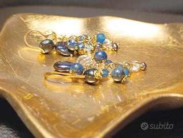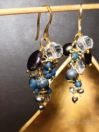 Pietra preziosa perla naturale keshi blu scuro,sodalite,diaspro blu,cristallo swarovski ,vetro frozen blu..base per orecchini realizzata in acciaio inossidabile rivestito con una lega color oro ad alta ipoallergenicità