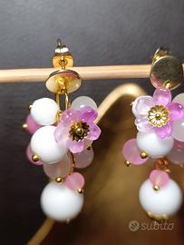 Pietra naturale quarzo rosa ,vetro frozen ceco , onice bianco ,Il fiore è realizzato a mano in vetro .La base degli orecchini è realizzata in acciaio inossidabile rivestito con una resistente lega ipoallergenica color oro.