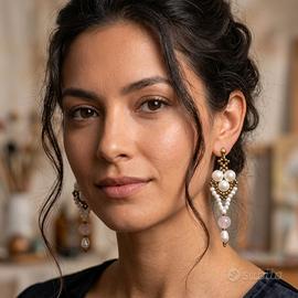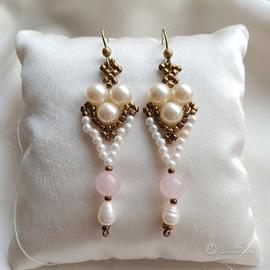 Orecchini eleganti in stile vintage in micro-tessitura artigianale con perle di fiume naturali e gemme quarzo rosa. Questi eleganti orecchini artigianali fondono sapienza tecnica e materiali preziosi in un design armonioso. La struttura centrale, realizzata tramite una meticolosa micro-tessitura manuale, intreccia luminose perle di Maiorca a minuscole rocailles color bronzo, creando un ricamo geometrico dal fascino senza tempo. La composizione si sviluppa verticalmente con l'inserimento di un quarzo rosa sferico, simbolo di delicatezza, che guida lo sguardo verso il finale pendente in perla di fiume. La lucentezza naturale delle perle e il calore del bronzo rendono questo gioiello un accessorio raffinato, perfetto per illuminare il volto