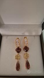 Luminosissimi orecchini con perno in acciaio dorato e strass bianchi con pendenti in cristalli nella tonalità del giallo ed amaranto.