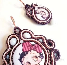 realizzati completamente a mano con la tecnica del soutache, orecchini asimmetrici: uno grande e uno piccolo con cabochon centrale con stampa betty boop. chiusura con monachella, retro in feltro