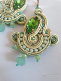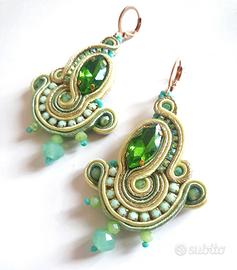 orecchini realizzati a mano con la tecnica soutache, pietra verde centrale con cristallini e strass cucito intorno, retro in camoscio.
