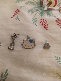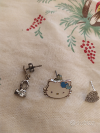 Orecchini spaiati argento: brillantino pendente €6, delfino pendente €6, cuore con brillantini €6, Hello Kitty originale smaltato €18.