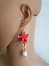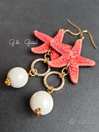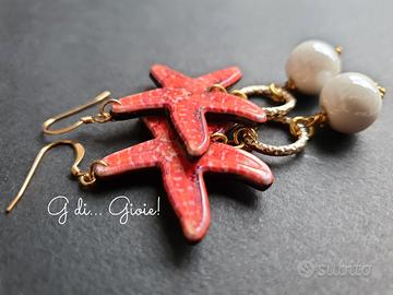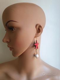 Orecchini con stelle marine e perle in ceramica bianca.