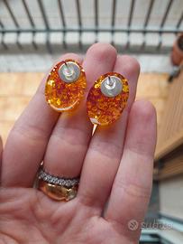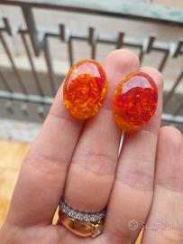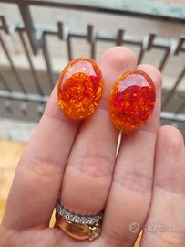 Orecchini vintage in ambra sintetica. molto belli. Uno di essi presenta una piccolissima puntina che fuoriesce dal cabochon, ma come potete vedere non si nota perché è impercettibile.