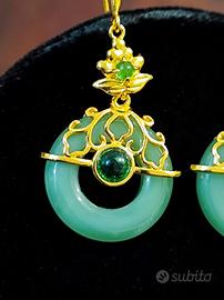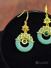orecchini stile vintage orientale retrò in acciaio placcati oro impreziositi da giada naturale hetian con ago in argento punzonato per donna accessorio raffinato