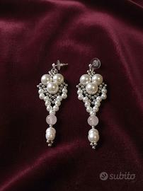Questi orecchini incarnano uno stile Neoclassico e Romantico, dove la precisione geometrica della tessitura a mano incontra la dolcezza dei materiali naturali. La struttura a ventaglio richiama l'eleganza dell'Art Nouveau, ma viene attualizzata dall'uso delle rocailles in acciaio che donano un riflesso argenteo quasi lunare. È un gioiello dal carattere etereo, pensato per una donna che ama un'estetica ricercata e "senza tempo". L'accostamento tra la perfezione delle perle di Maiorca e l'irregolarità organica delle perle di fiume crea un contrasto sofisticato, rendendo ogni pezzo un piccolo capolavoro di design artigianale, ideale per chi desidera distinguersi con grazia e luminosità in ogni occasione speciale.