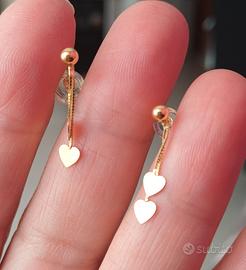 Delicati orecchini Stroili in oro giallo 9k, design a cuore. Due pendenti con catenelle, per ogni orecchino, attaccati a un bottoncino oro. Nuovi con scatola e confezione originale, non vendita fuori dalla piattaforma, non perditempo. Possibilità di creare set con sconti e spesa di spedizione unica,per chi è interessato.