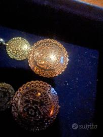 Paio di orecchini in metallo, con due cerchi bombati e lavorati, color oro giallo e oro rosso, lunghezza cm 6