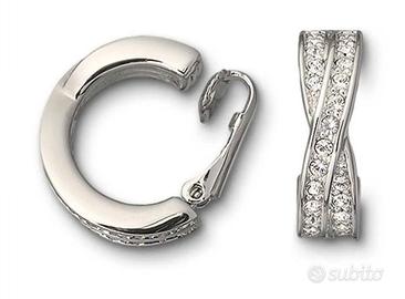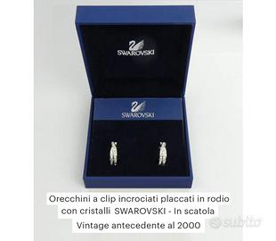 Orecchini a clip - disegno incrociato - placcati in rodio con cristalli Swarovski - loghi ufficiali impressi all'interno degli orecchini, scatola presente, manca libretto interno. Vintage antecedente al 2000. Mai indossati.